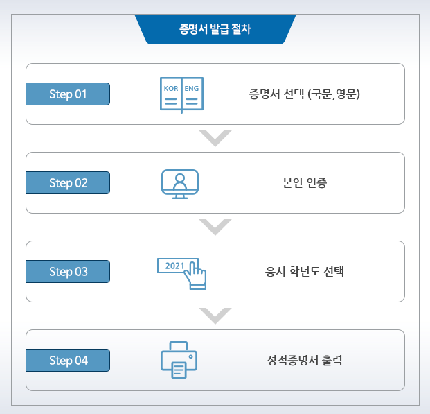 - 현장에서 신청서를 제출하고, 수수료를 납부하면 성적증명서를 발급받을 수 있습니다.